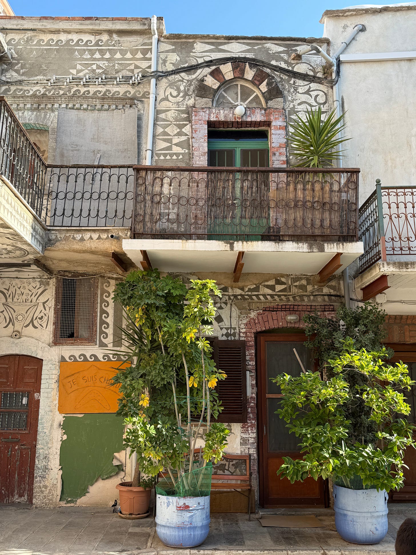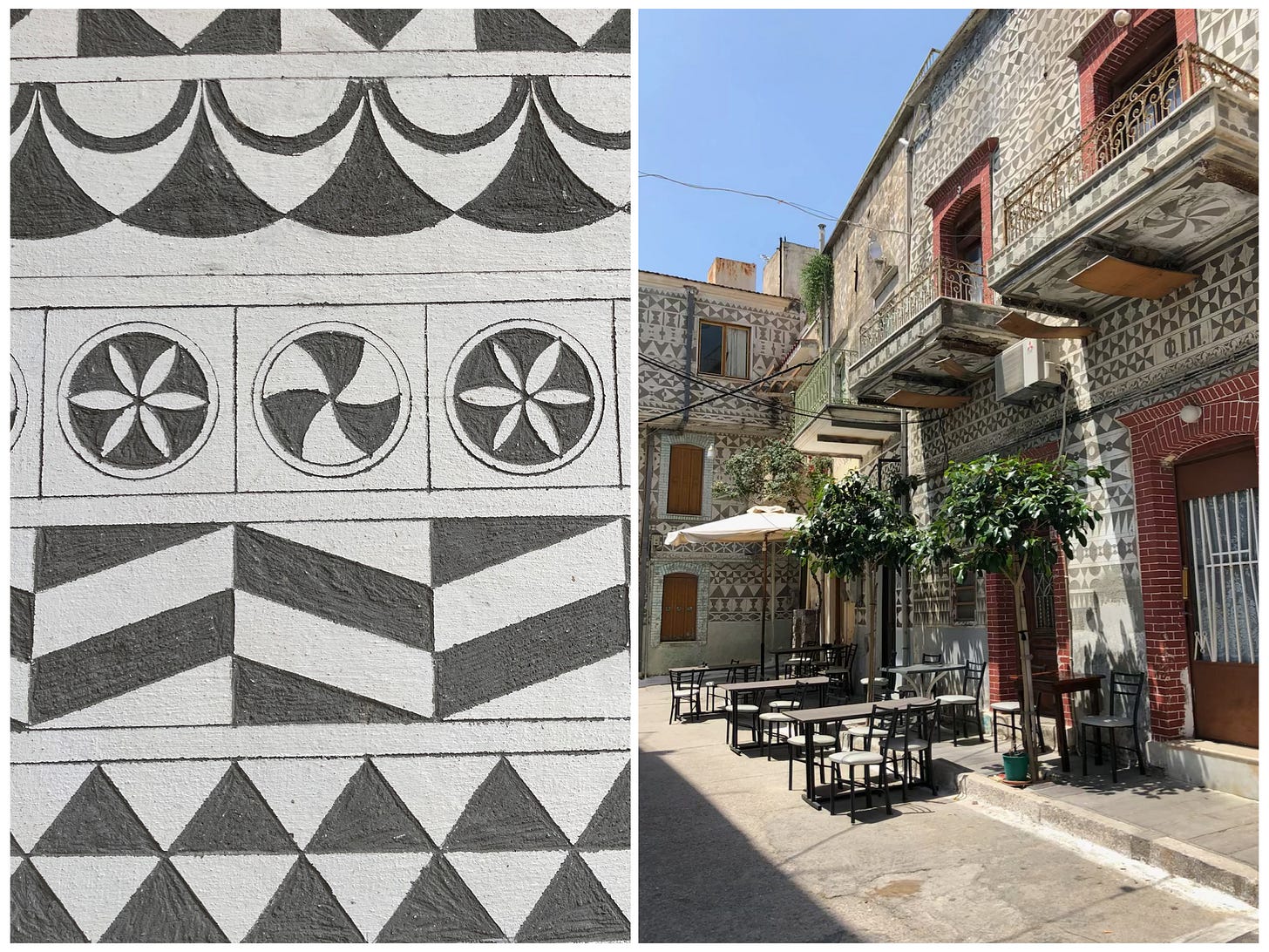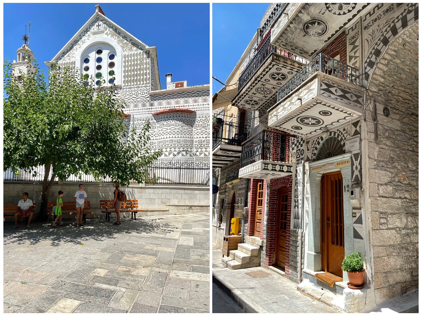 My Greek sister in law, Kelly Flamos, whose family lives in Chios, introduced me to the painted village of Pyrgi, where black and white geometric shapes and intricate patterns cover every available surface area of the built landscape— facades, pillars, balconies, undersides of arches, the interior of churches, and on and on, you name it, it’s decorated.